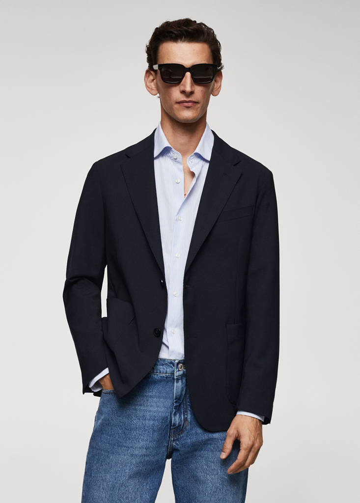 Mischgewebe aus Schurwolle. Leichter Stoff. Slim Fit. Reverskragen. Brustleistentasche. Zwei aufgesetzte Taschen vorne. Lange Ärmel mit Knopfmanschetten. Gerader Saum. Doppelter Rückenschlitz. Teilweise gefüttert. Innentasche mit Knopfverschluss. Vorderer Verschluss mit Knöpfen