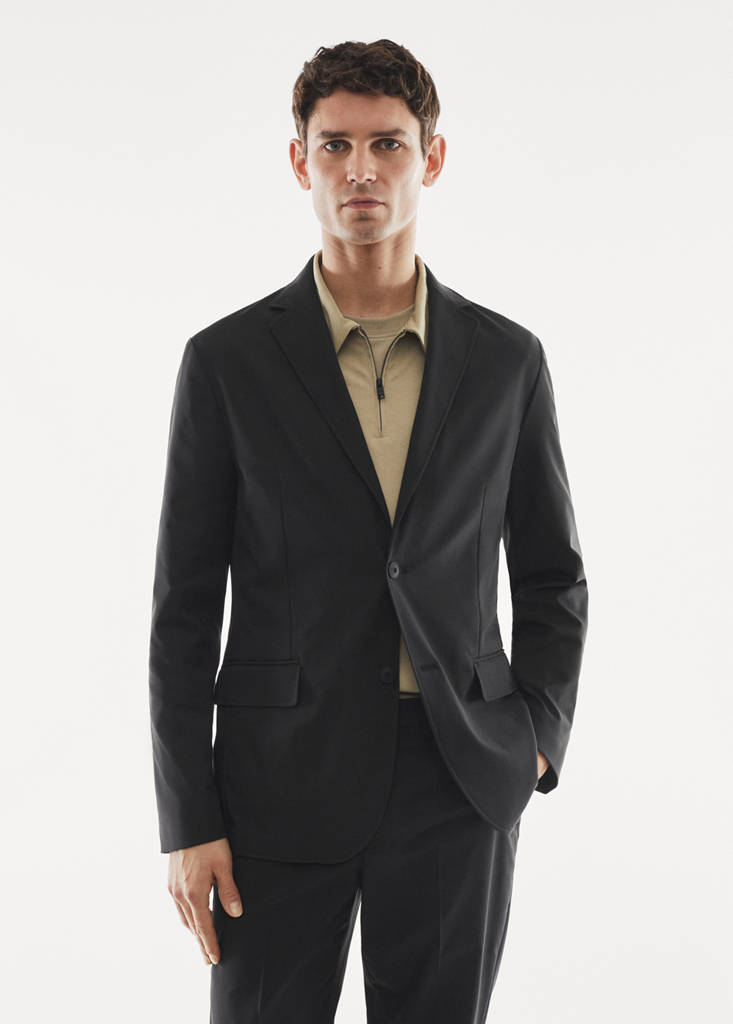 Slim Fit. Ultraleichter Stoff. Leichter Stoff. Fallendes Revers. Zwei Knöpfe am Vorderteil. Lange Ärmel. Rückenschlitz. Innentasche mit Knopfverschluss. Futter. Gerader Saum