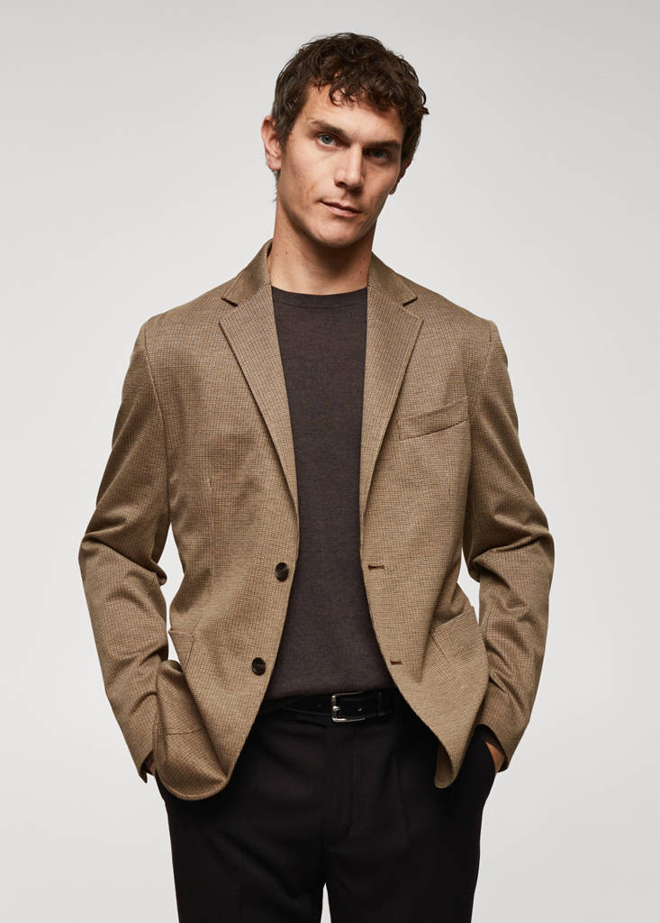 Slim Fit. Feines Hahnentrittmuster. Reverskragen. Brustleistentasche. Zwei aufgesetzte Taschen vorne. Doppelter Rückenschlitz. Innentasche mit Knopfverschluss. Teilweise gefüttert. Vorderer Verschluss mit Knöpfen