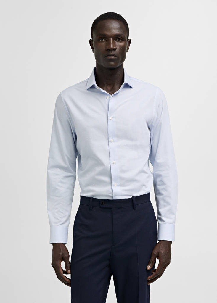 100 % Baumwolle. Twill-Gewebe. Slim Fit. Nadelstreifenmuster. Haifischkragen. Knopfverschluss vorne. Geknöpfter langer Ärmel. Abgerundeter Saum
