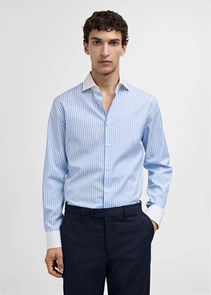 Slim Fit. Kontrastierender Hemdkragen. Lange Ärmel mit Knopfmanschetten. Streifenmuster. Abgerundeter Saum. 100% Baumwolle. Vorderer Verschluss mit Knöpfen
