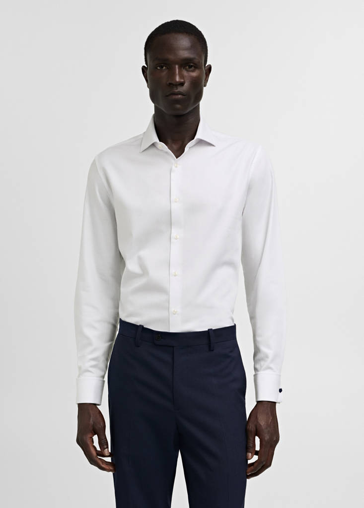 Baumwolle. Regular Fit. Haifischkragen. Lange Ärmel mit Knopfmanschetten. Doppelmanschette mit eingearbeitetem Manschettenknopf. Knopfverschluss vorne