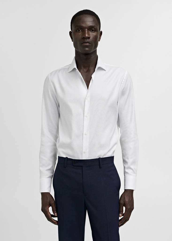Slim Fit. Strukturierte Baumwolle. Haifischkragen. Lange Ärmel mit Knopfmanschetten. Vorderer Verschluss mit Knöpfen. Abgerundeter Saum. Klassischer Kragen. 100% Baumwolle