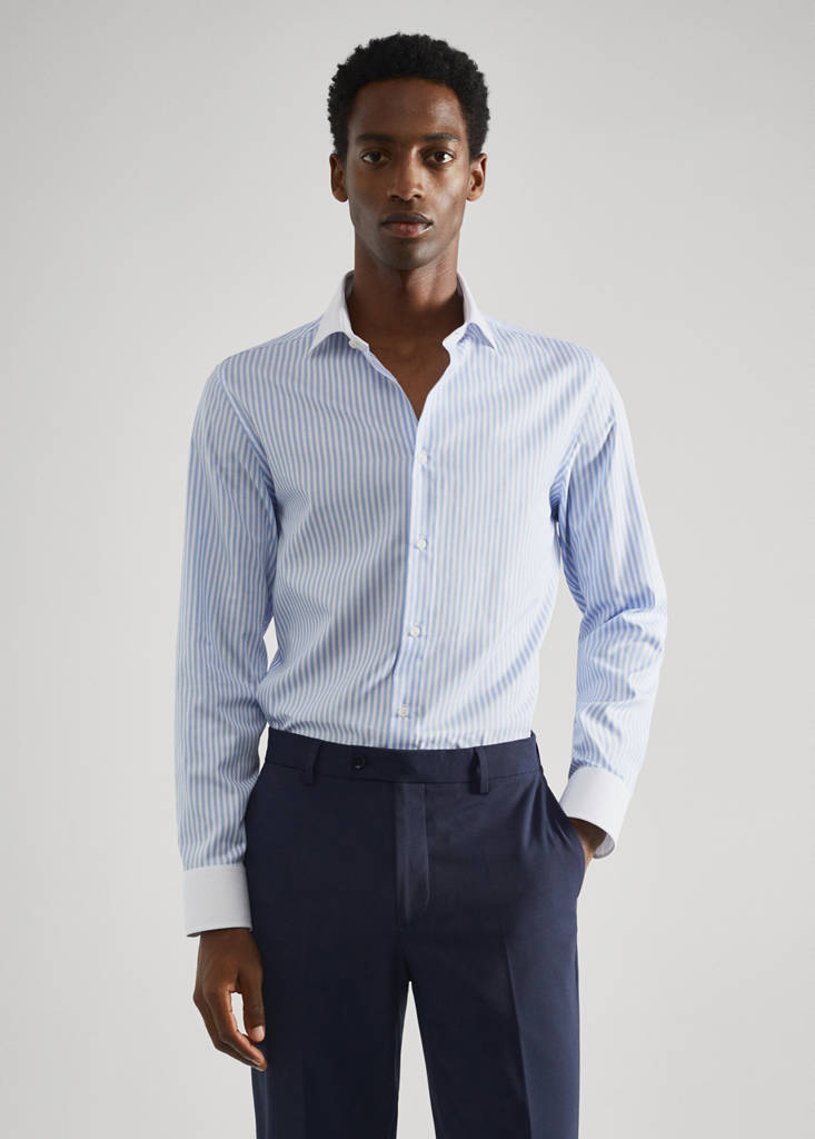 Exklusiv online. Slim Fit. Design-Mix. Streifen-Design. Kontrastabschlüsse. Klassischer Kontrastkragen. Lange Ärmel mit Knöpfen an den Enden. Knopfverschluss. Das Model ist 187 cm groß und trägt Größe M