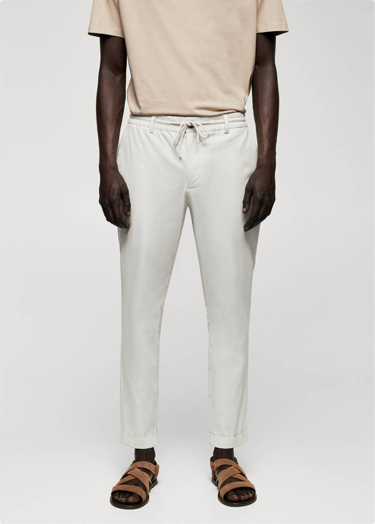 Slim Fit. Baumwolle. Seersucker-Gewebe. Elastische Taille mit regulierbarem Tunnelzug. Schlaufen für Gürtel. Doppelter Knopf und Reißverschluss. Zwei Vordertaschen. Die rechte enthält eine Münztasche. Zwei Paspeltaschen hinten. Umschlag am Saum. Das Model ist 190 cm groß und trägt Größe 42