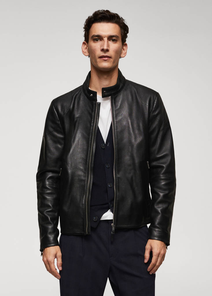 100% Schafleder. Slim Fit. Biker-Design. Kurzes Design. Hoher Kragen mit Knopfverschluss. Reißverschluss auf der Vorderseite. Lange Ärmel. Zwei seitliche Zip-Taschen. Futter. Innentasche