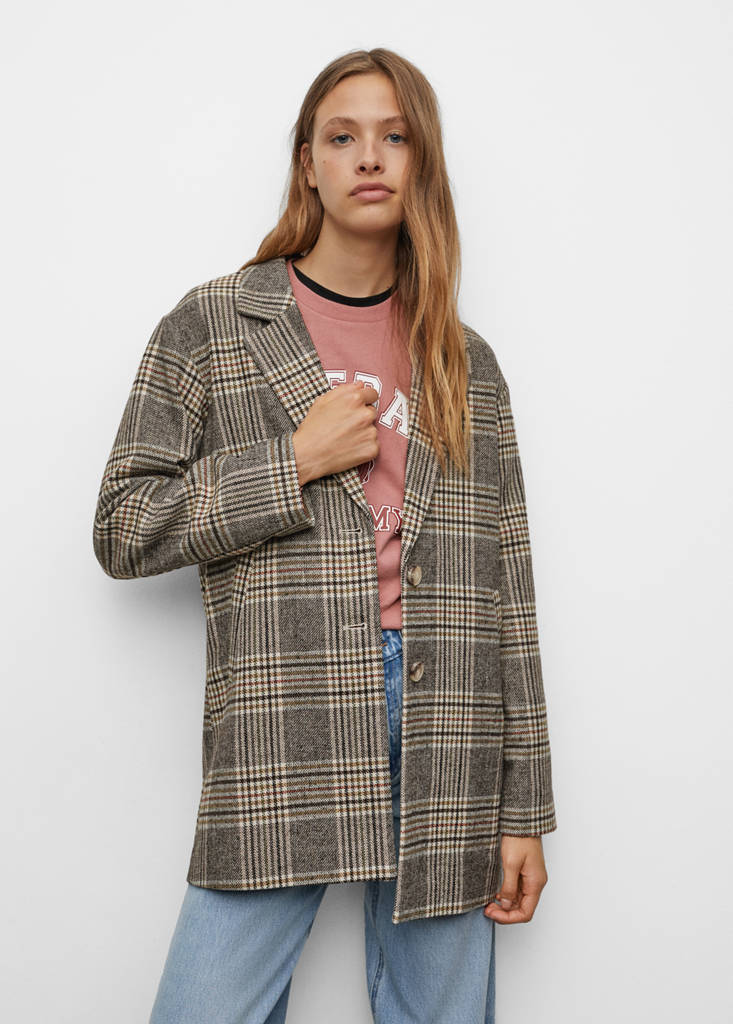 Mit Wolle gewebt. Hahnentrittmuster. Grobe Struktur. Hemdkragen mit Revers. Peak Lapel. Vorderer Verschluss. Nur Innenfutter. Medium Design. Gerades Design. Lange Ärmel. Seitentaschen. Knopfverschluss vorne. Teen Kollektion