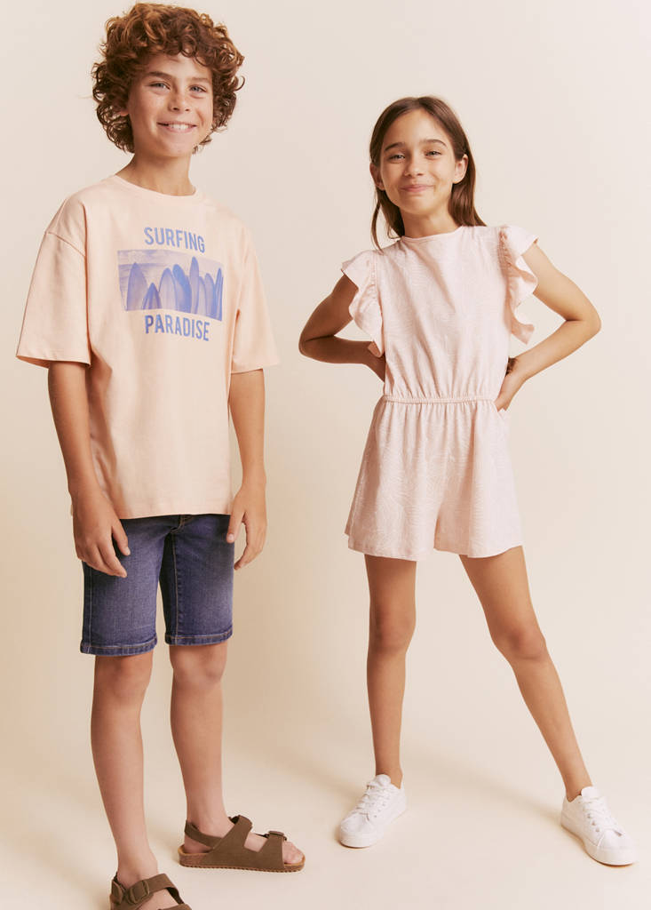 100 % Baumwolle. Kurzes Design. Blatt-Print. Elastische Taille. Rundhalsausschnitt. Ärmel mit Volantdetails