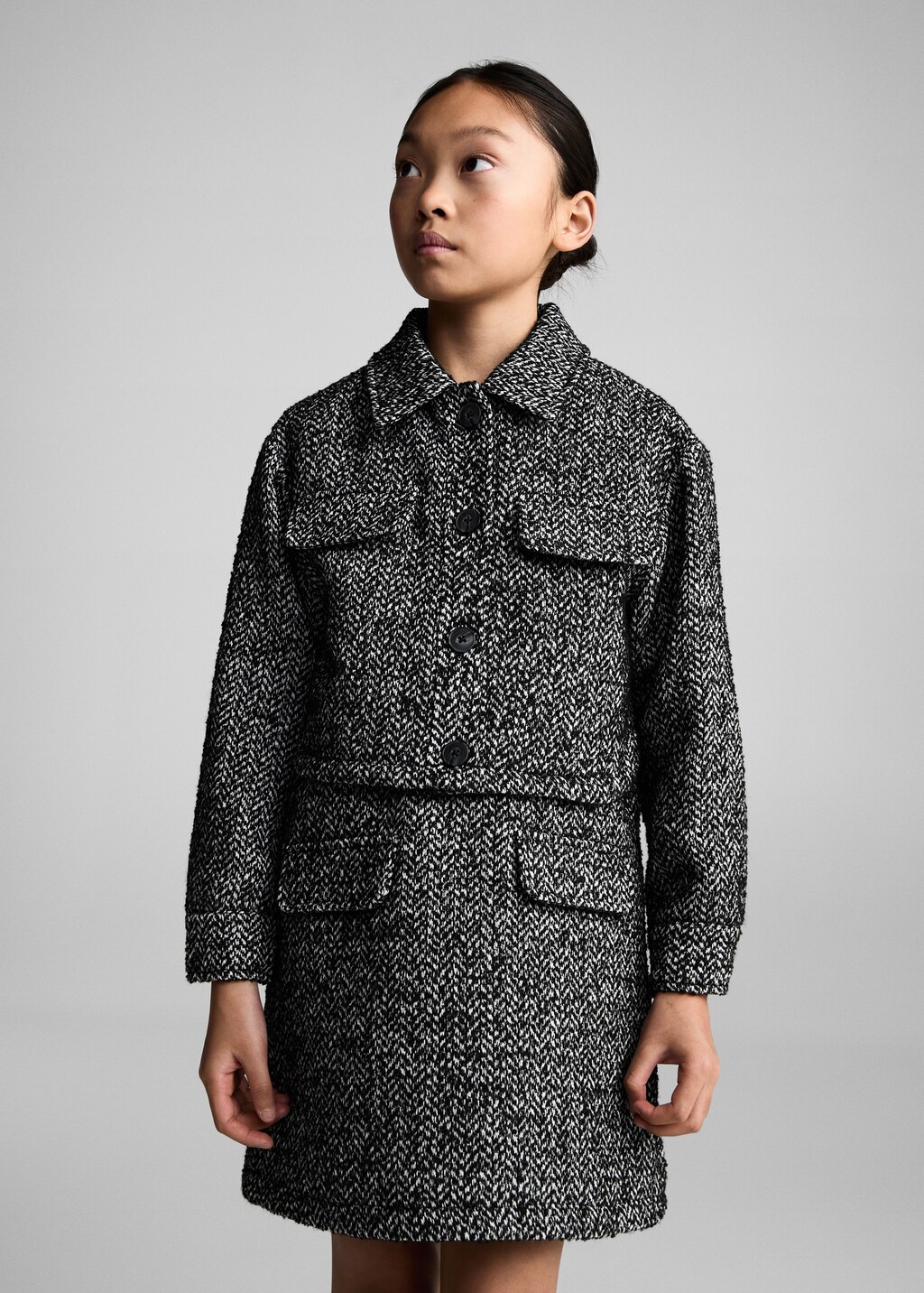 Mit Wolle gewebt. Langarm. Gerades Design. Kurzes Design. Hemdkragen. Zwei Pattentaschen. Knopfverschluss. Total Look. Futter.