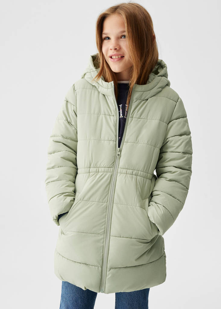 Basics-Kollektion, gestepptes Design, langes Design, gerades Design, lange Ärmel, kapuze, zwei Seitentaschen, reißverschluss vorne, etikett an der Innenseite für persönliche Daten.