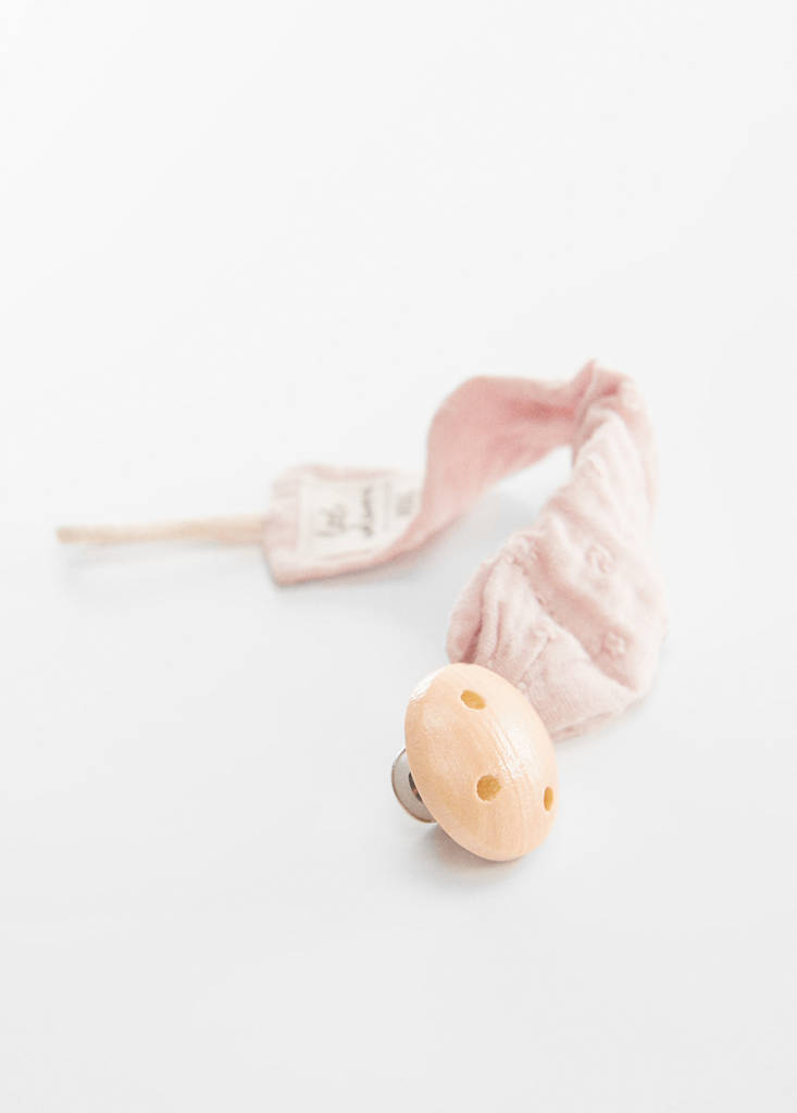 Schnullerhalter aus Holz. Stickerei-Detail. Druck. Metallclipverschluss