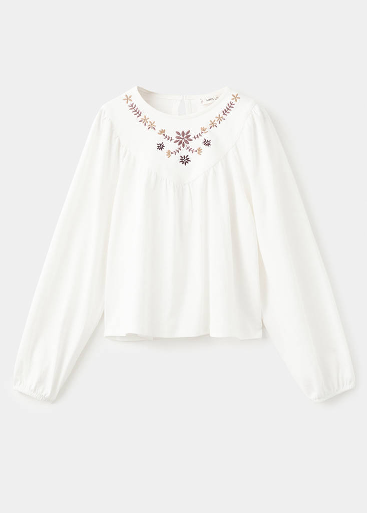Tissu 100 % coton. Coupe droite. Détails floraux brodés. Détail froncé sur la poitrine. Col rond. Manches longues. Poignets froncés