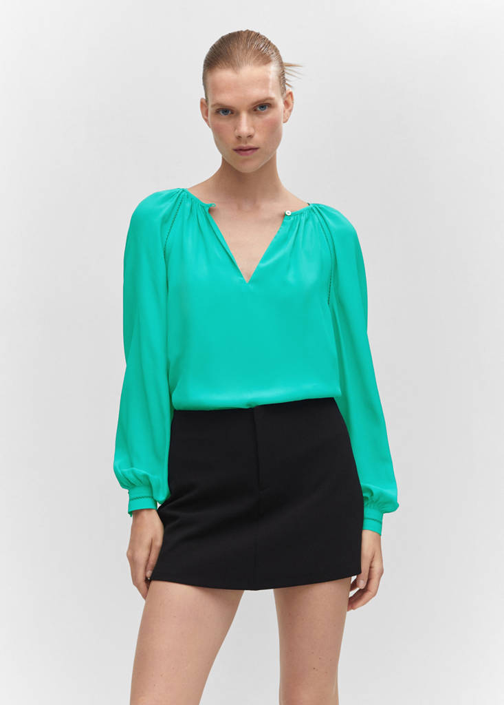 Tissu fluide. Design droit. Col rond. Manches longues raglan. Détail ajouré. Détails froncés. Fermeture à bouton sur le devant. Looks de bureau