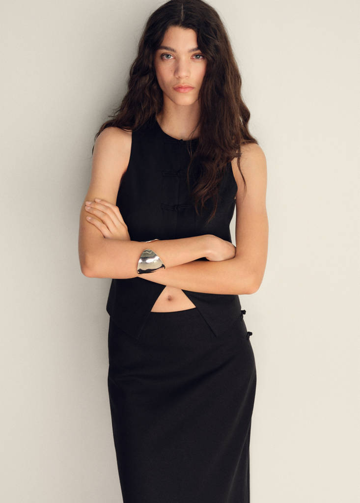 Tissu mélange de coton et lin. Style costume. Col rond. Sans manches. Fermeture avant. Total look