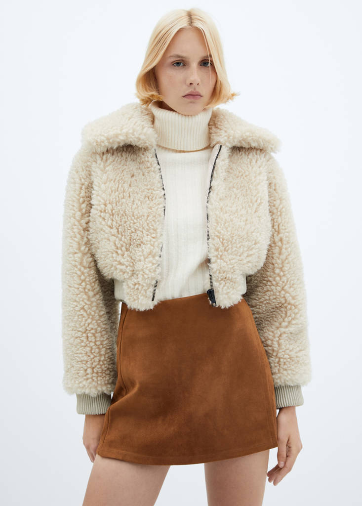 Tissu suédine, tissu élastique, coupe courte, ajusté, sans fermeture, total look.