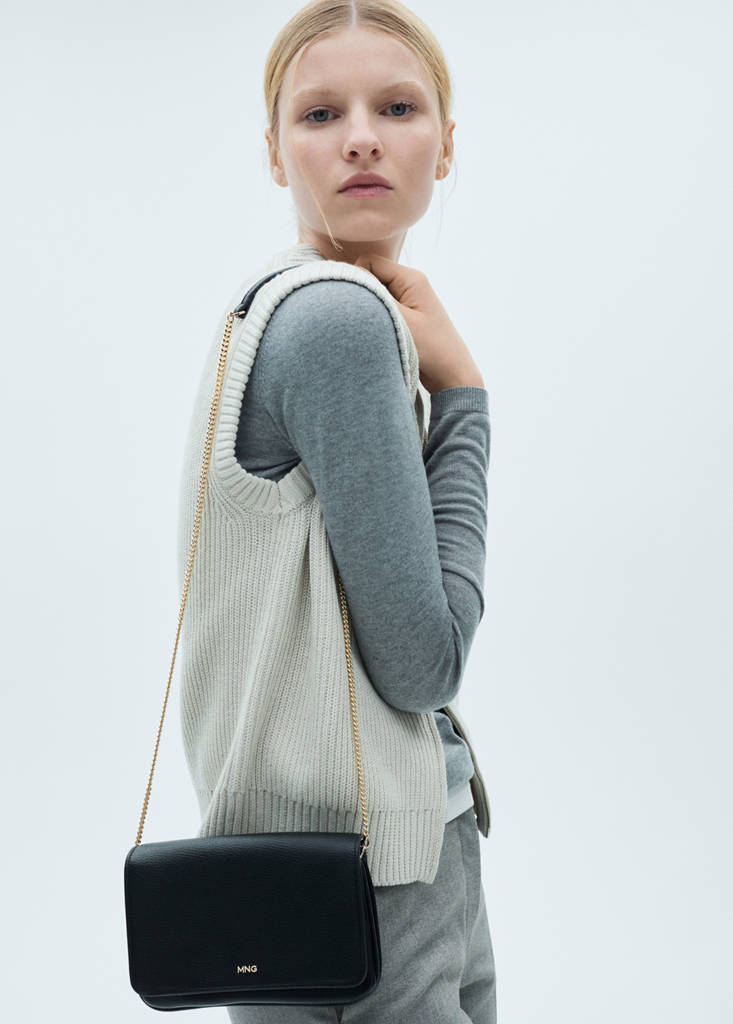 Taille petite. Effet cuir. Anse bandoulière. Anse en chaîne. Deux poches intérieures. Fermeture à rabat avec bouton magnétique. Logo en relief. Doublure intérieure. Chaîne fine métallique. Double compartiment intérieur. Coupe croisée