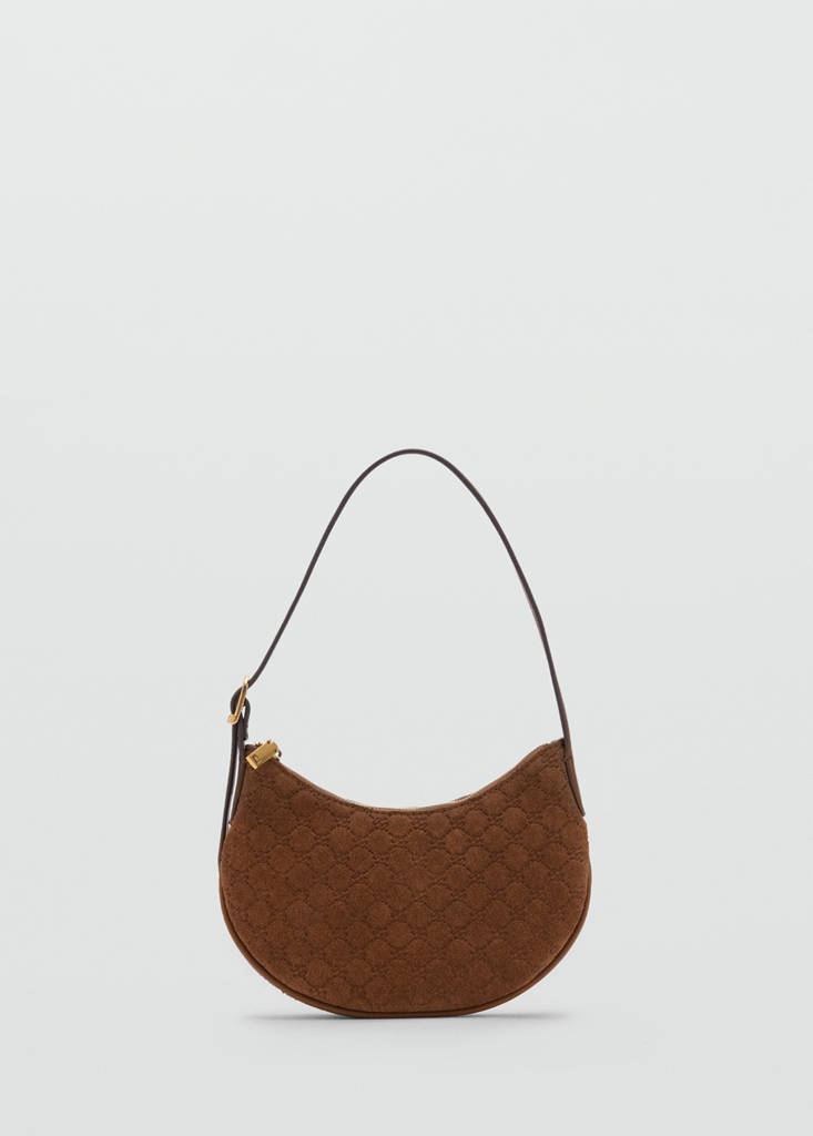 Taille moyenne. 100 % cuir bovin. Suède. Anse d'épaule. Anse réglable à boucles. Motif Mangologo. Fermeture à glissière. Doublure intérieure