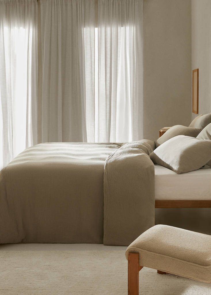 Lit de 180/200cm. 100 % coton. 250 fils. Style méditerranéen. Tissu en mousseline. Combinez-le avec les taies d'oreiller et les housses de coussin de la même collection pour une chambre en parfaite harmonie. Fermeture à boutons. Ne comprend pas le rembourrage. Dimensions : 260x240 cm
