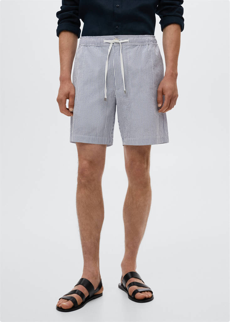 Slim-fit. Tissu en coton durable. Tissu seersucker. Taille élastique avec cordon. Fermeture Éclair avec bouton. Deux poches latérales. Deux poches passepoilées à l'arrière. Le mannequin mesure 187 cm et porte une taille 42