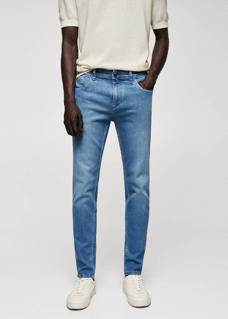 Coupe skinny. Denim Water-Saver : consommation d’eau réduite pendant le processus de production. Tissu stretch. Passants pour la ceinture. Deux poches latérales. Deux poches plaquées à l'arrière. Poche gousset. Le mannequin mesure 183 cm et porte une taille 42. Style jean