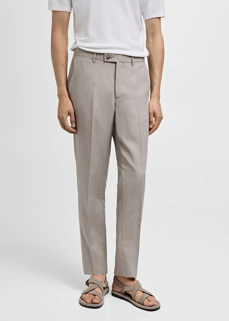 Slim fit. Taille mi-haute. Passants de ceinture. Fermeture à boutons, agrafe et fermeture Éclair. Détail de pli à l'avant. Deux poches avant. Poche passepoilée boutonnée à l'arrière. Collection tailleur. Tissu mélange de lyocell, coton et lin. Détail de pli marqué à l'avant et à l'arrière