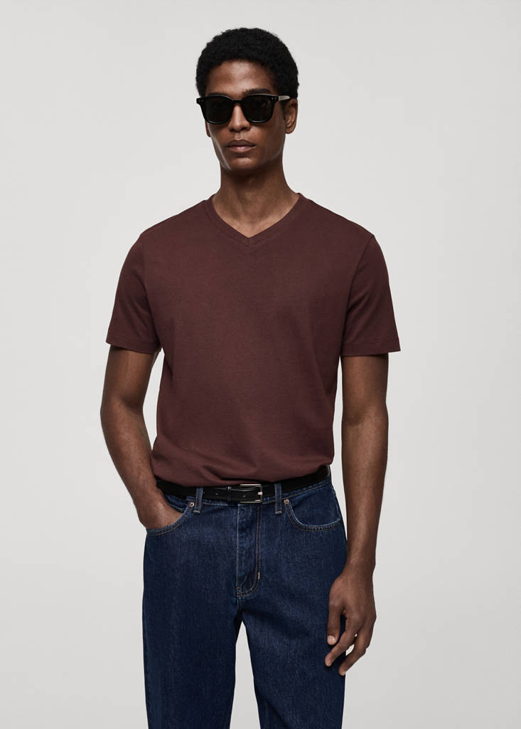 Slim fit. Tissu 100 % coton. Col en V. Manches courtes. Ourlet droit. Les couleurs sable et bordeaux sont exclusives en ligne. Les couleurs marron moyen et verte sont des exclusivités en ligne. Les couleurs marron moyen et bleu indigo sont des exclusivités en ligne. Manches courtes