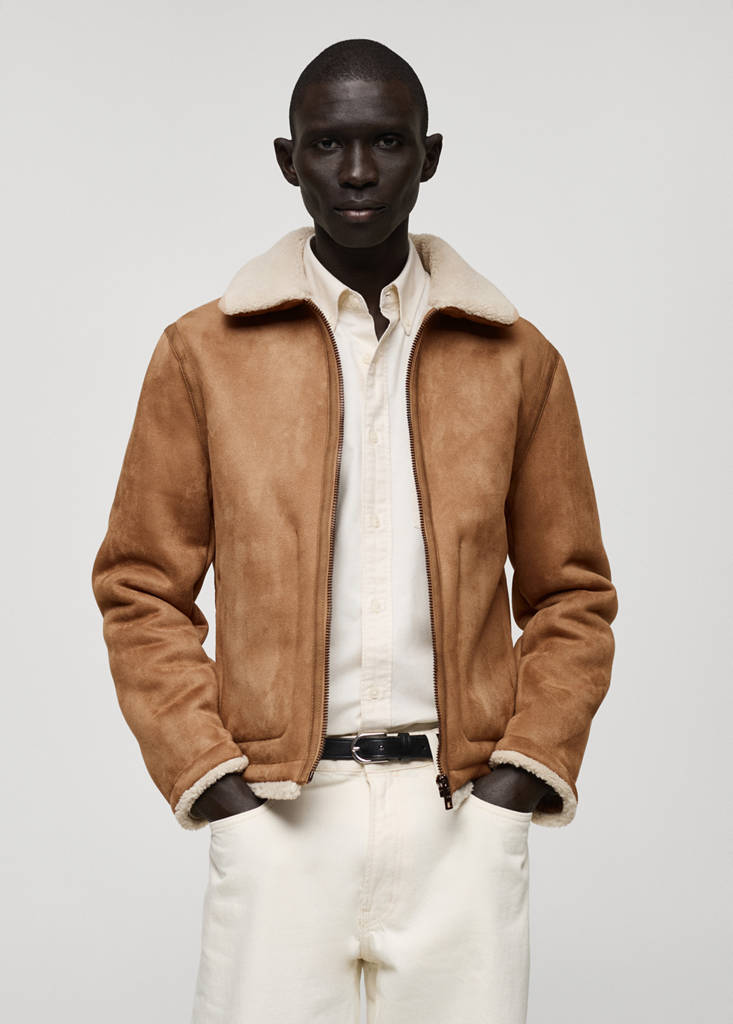Fermeture à zip. Tissu effet daim. Doublure moutonnée. Col chemise moutonné. Poche intérieure plaquée. Deux poches latérales passepoilées