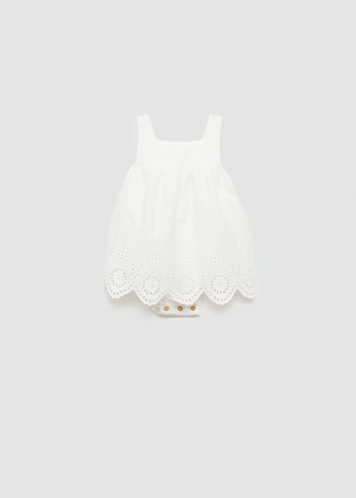 100% coton. Broderie suisse. Coupe courte. Coupe droite. Bas ondulé. Design ondulé. Doublure. Fermeture à boutons