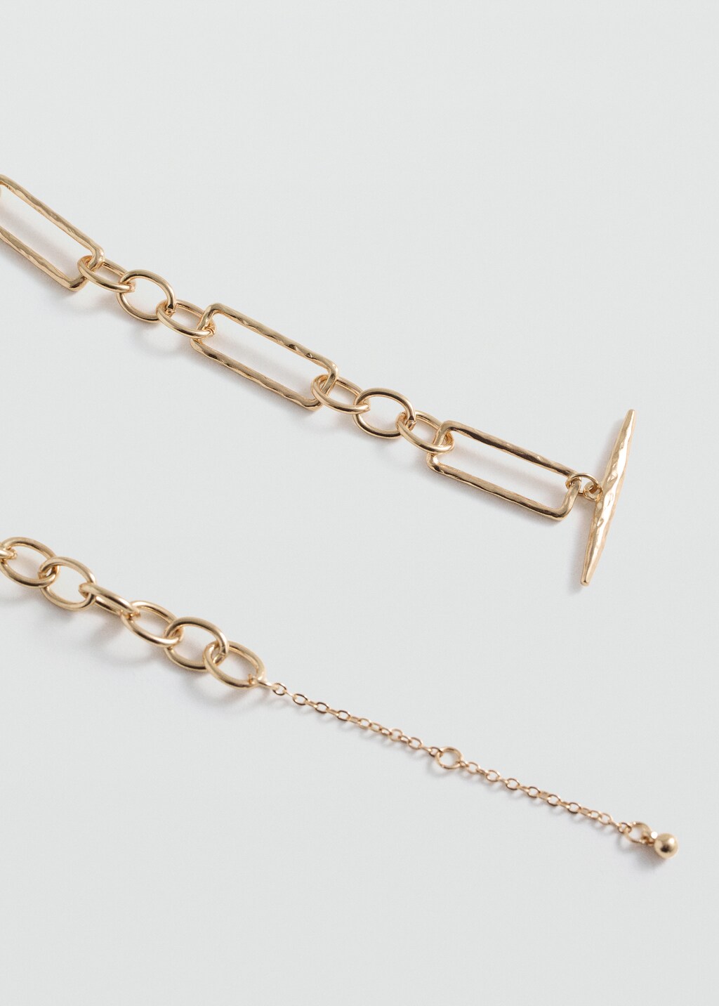 Anneaux métalliques. Design long. Fermoir à chaînette et mousqueton.