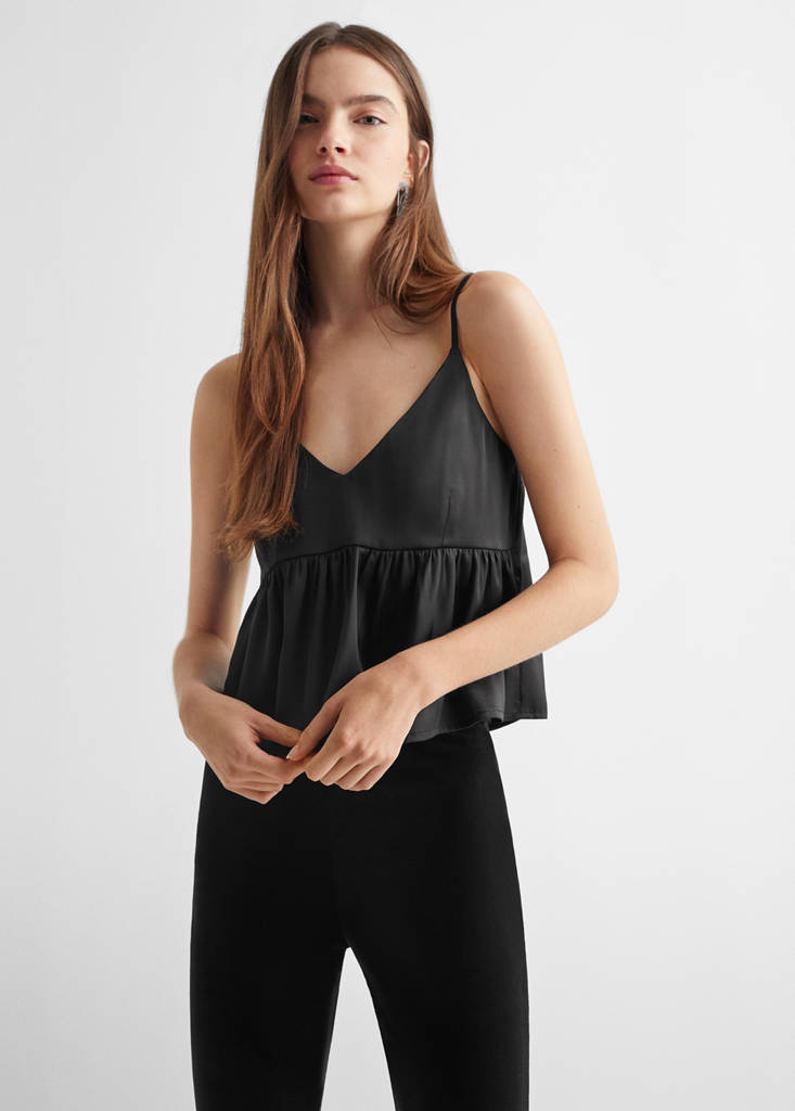 Collection fêtes, cérémonie et communion. Effet satiné. Design à volants. Coupe droite. Bretelles fines ajustables. Sans manches. Sans fermeture