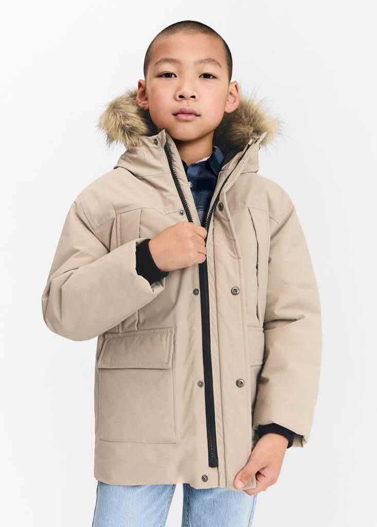 Back to school collection. High neck. Detachable faux fur hood. Zip and button fastening. Label for personal data. Zip and press stud fastening. Straight design. Long sleeves. Quilted design. Jeans with tie closure. Inner lining