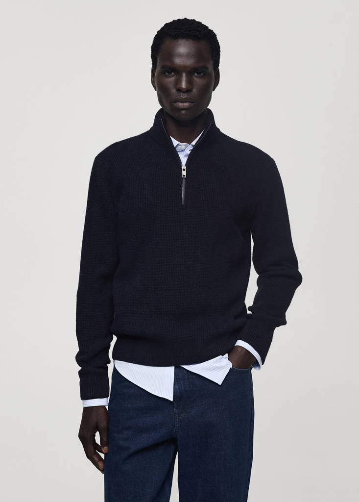 The blue and white models are online exclusives , regular fit, medium knit, recycled materials, long sleeve, perkins neck with zip, cable knit finish, the model is 185 cm tall and is wearing a size M.
