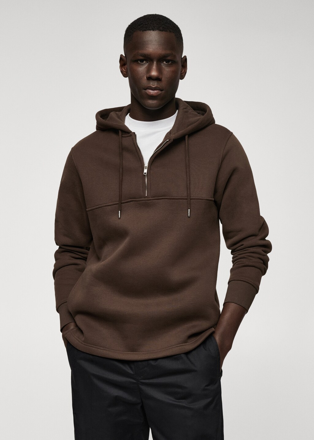 Zipped hoodiePrice historyInitial price struck through [€ 49.99 ]€ 49.99Current price [€ 38.99 ]€ 38.99-22%Select a colourBrownSelect your sizeXSNot available. I want it!SNot available. I want it!MNot available. I want it!LNot available. I want it!XLNot available. I want it!XXLNot available. I want it!Size guideNotify meDescriptionRegular fit. Cotton-blend fabric. Hood. Long sleeve. Zip closure at the neck. The model is 187 cm tall and is wearing a size M.See detailsShare