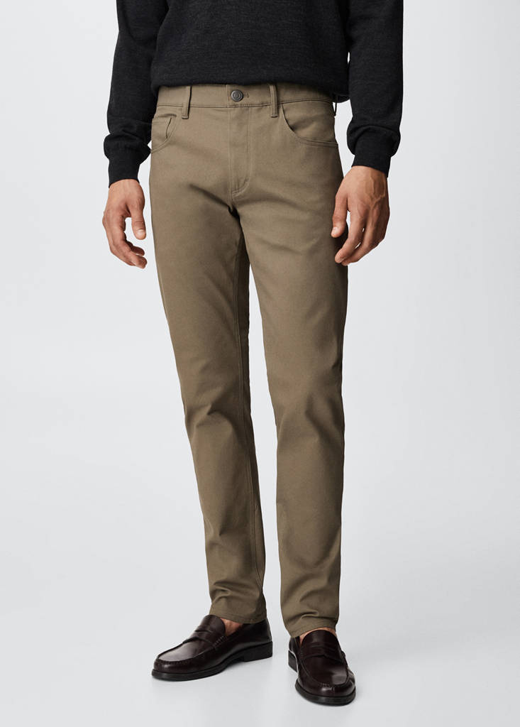 Basics Collection. Slim fit. Sustainable cotton fabric. Stretch cotton fabric. Serge fabric. Two side pockets. Coin pocket. Two patch pockets on the back. Loops. Zip and one button fastening. The model is wearing a size 42