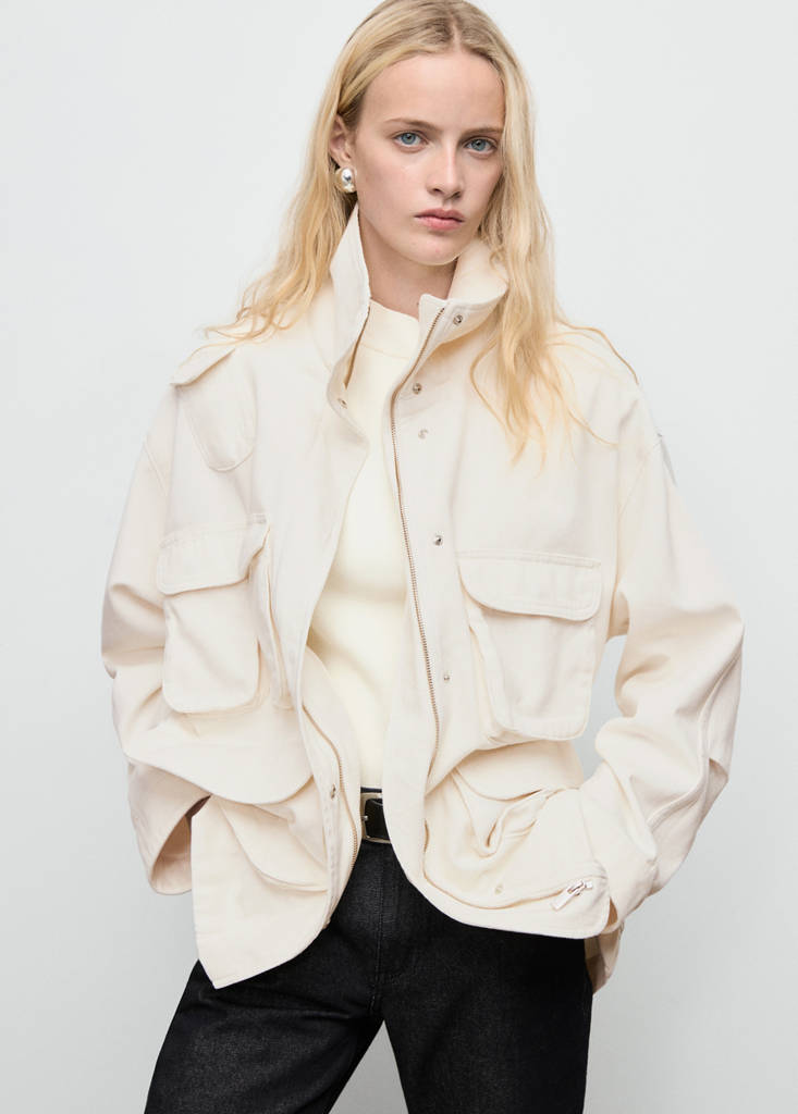 Crafted from denim-style cotton fabric, this garment features an oversized design with a funnel neck. It has long sleeves, patch pockets and flaps, and a zip and press-stud fastening