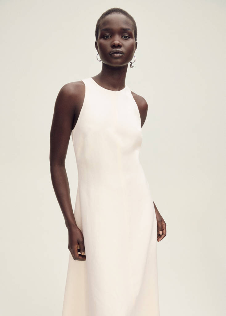 Linen mix. Midi design. A-line design. Halter neck. Sleeveless. Frayed hem. Back zip fastening. Selection Collection
