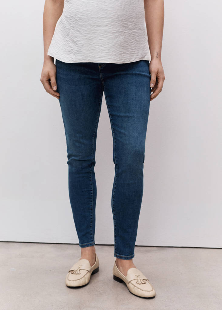 Denim-style cotton fabric. Fitted design. Low waist. Belt loops. Two patch pockets at the back. Zip and button fastening. Inseam 74 cm. We recommend you buy your usual size. Provides comfort and freedom of movement. Maternity. Standard design. Elastic band. Skinny fit. Elasticated waistband