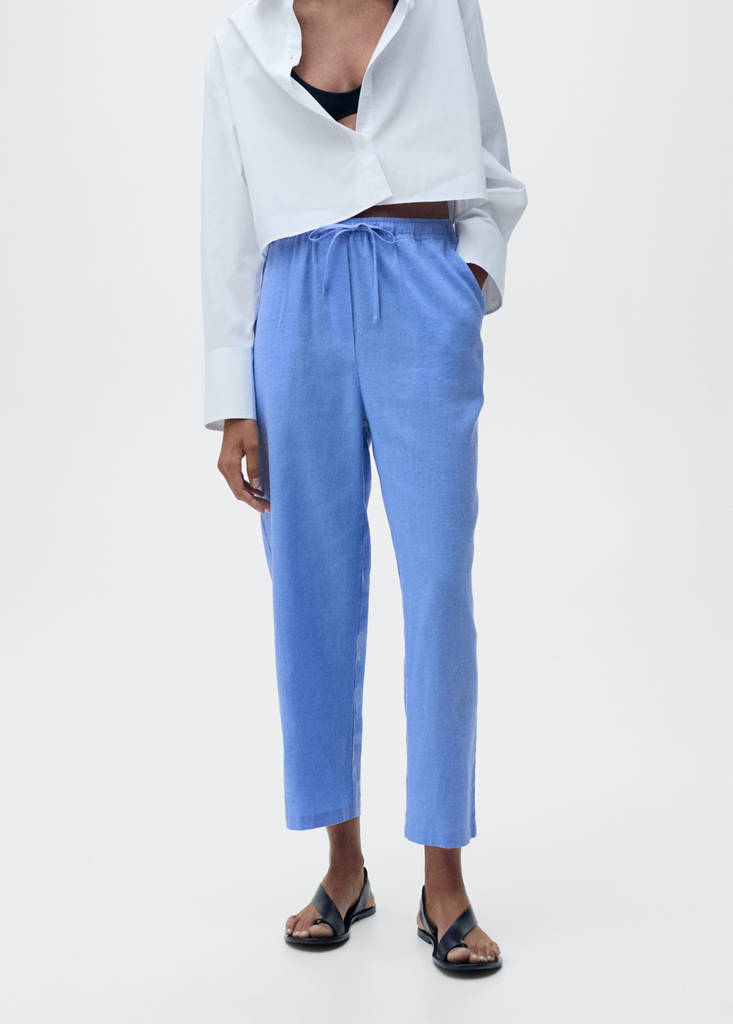 Cotton and linen blend fabric. Straight design. Long design. Mid-rise. Elasticated waistband. Adjustable waist tie. No Fastening. Available Plus