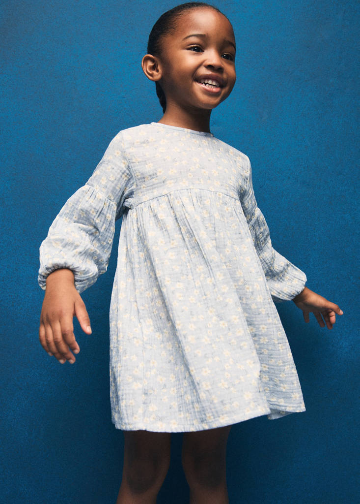100 % coton. Tissu effet bambula. Coupe droite. Imprimé floral. Boutons imitation bois. Taille froncée. Col rond. Manches longues avec poignets élastiques et fronces. Fermeture à boutons à l'arrière