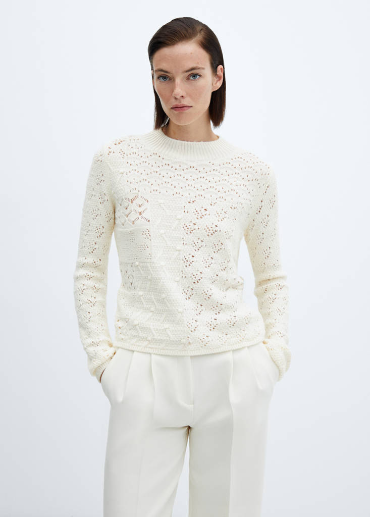 Maille ajourée. Point médian. Coupe droite. Col rond. Manche longue. Sans fermeture. Tissu en crochet