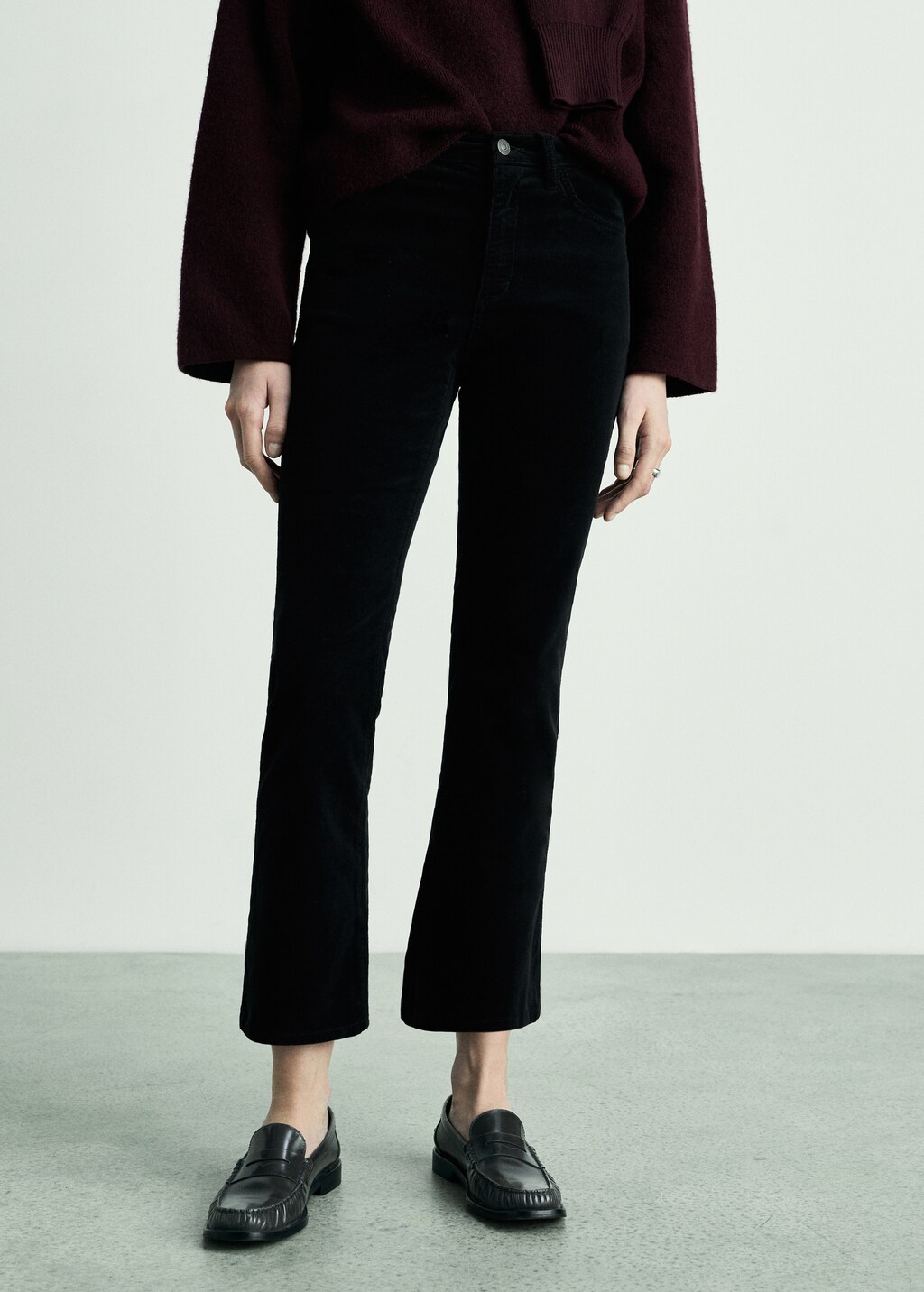 Silhouette Évasée/Flare. Taille Regular Waist. Structure Plate Moyenne. Longueur Crop. Tissu élastique. Flare. Style flare. Taille haute. Passants de ceinture. Cinq poches. Fermeture éclair et bouton. Tissu en velours côtelé. Longueur intérieure 65 cm.