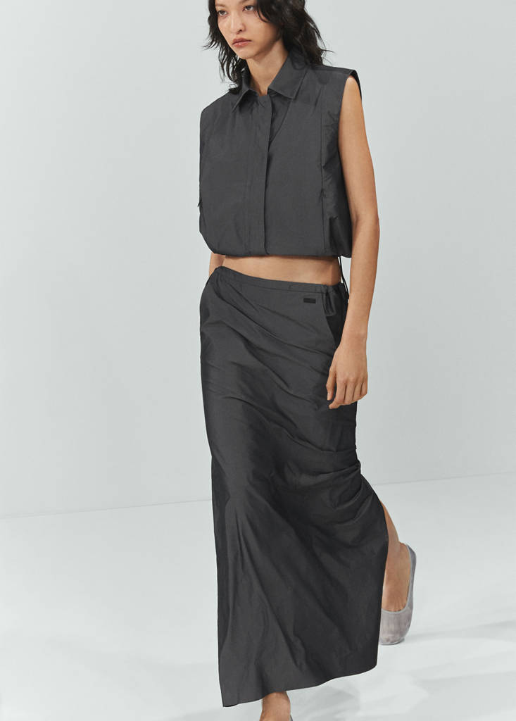 Tissu technique. Tissu effet réfléchissant. Tissu fluide. Design long. Coupe droite. Taille élastique ajustable. Deux poches latérales. Sans fermeture. Ouverture arrière en bas. Doublure. Total look