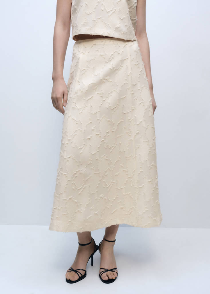 Tissu texturé. Coupe midi. Design évasé. Taille mi-haute. Fermeture Éclair sur le côté. Total look. Ce vêtement appartient à notre collection événement, conçue pour faire de vous l'invitée parfaite à toute fête, mariage ou cérémonie.