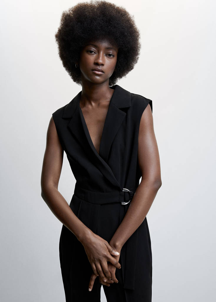 Tissu fluide. Coupe longue. Droit. Col en V avec rabat. Revers crantés. Sans manches. Taille réglable. Doublure. Disponible Plus. Collection fêtes et cérémonies