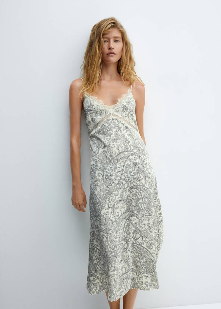 Tissu fluide. Coupe midi. Coupe droite. Style lingerie. Imprimé paisley. Col en V. Sans manches. Bretelles fines. Détail dentelle
