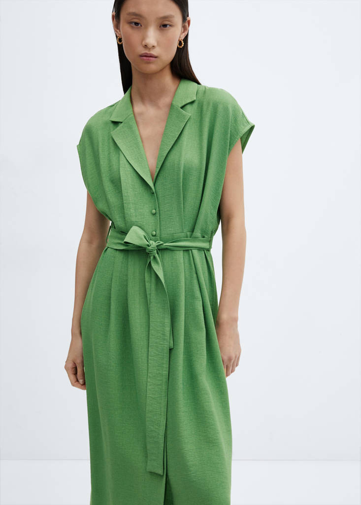 Tissu fluide. Coupe midi. Coupe droite. Col en V. Revers. Revers à encoche. Manches courtes. Passants de ceinture. Ceinture ajustable. Fermeture à boutons sur le devant