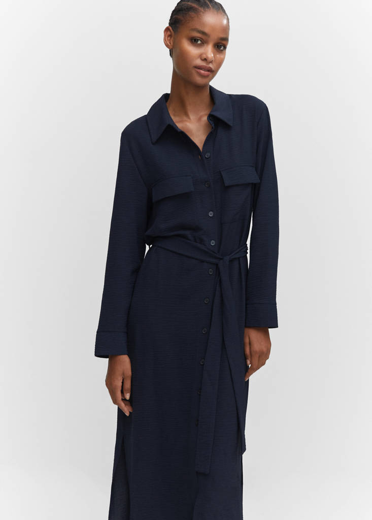 Tissu fluide, style chemisier, droit, coupe midi, col chemise, manches longues, deux poches à rabat à l’avant, fermeture boutonnée sur le devant, fentes latérales.