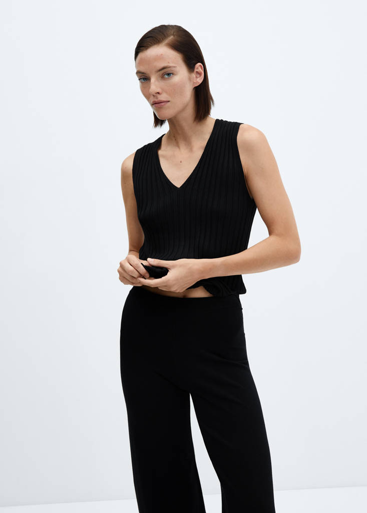 Maille fine. Maille côtelée. Col en V. Sans manches. Coupe ajustée