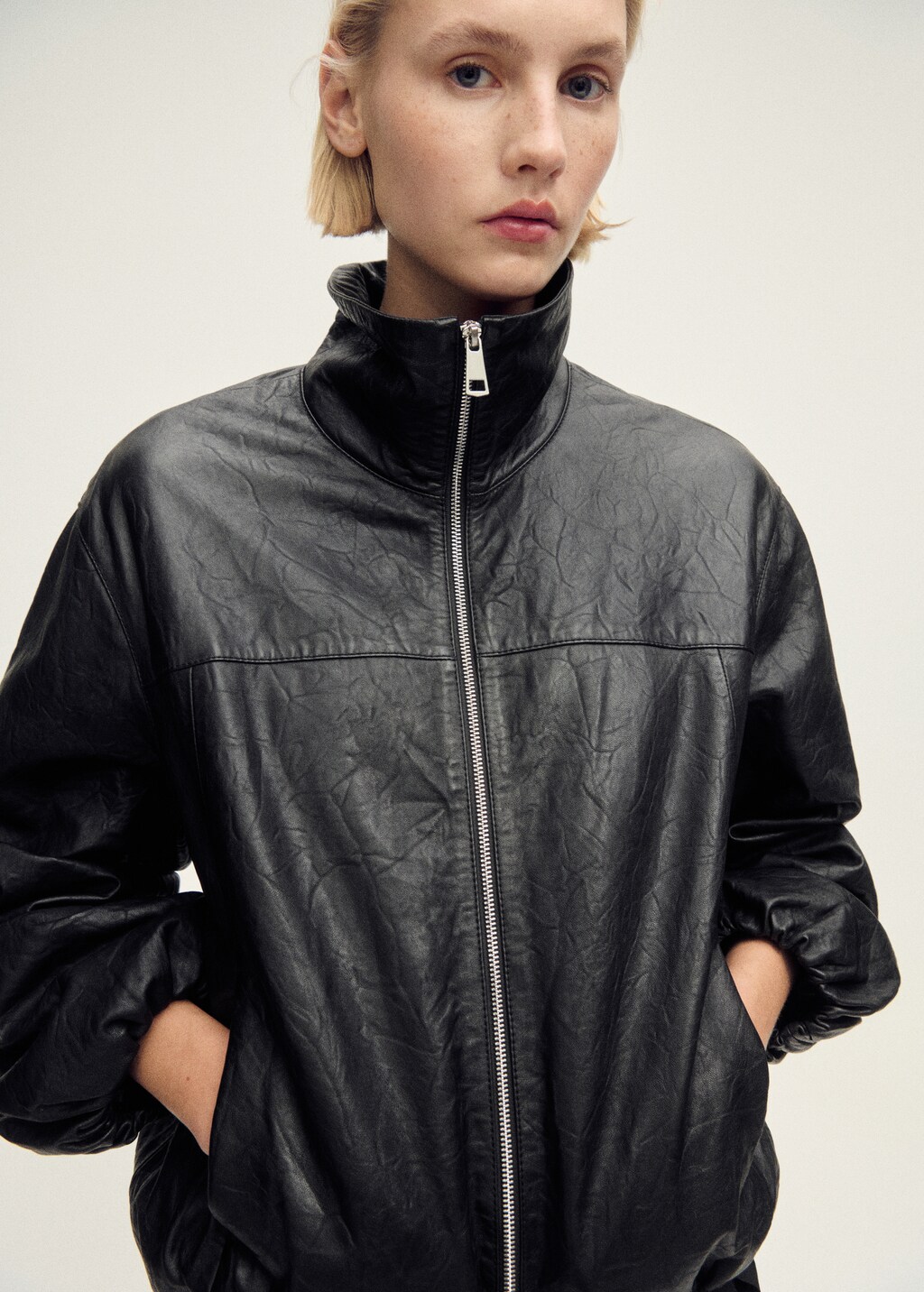 100 % cuir ovin. Design oversize. Col montant. Manches longues avec poignets élastiques et fronces. Deux poches latérales. Fermeture Éclair sur le devant. Doublure intérieure. Collection Selection.