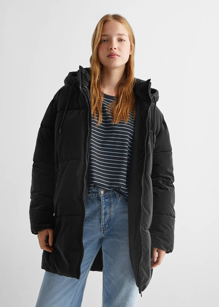 Tissu polyester, tissu effet brillant, matelassé, coupe longue, À capuche, fermeture Éclair.
